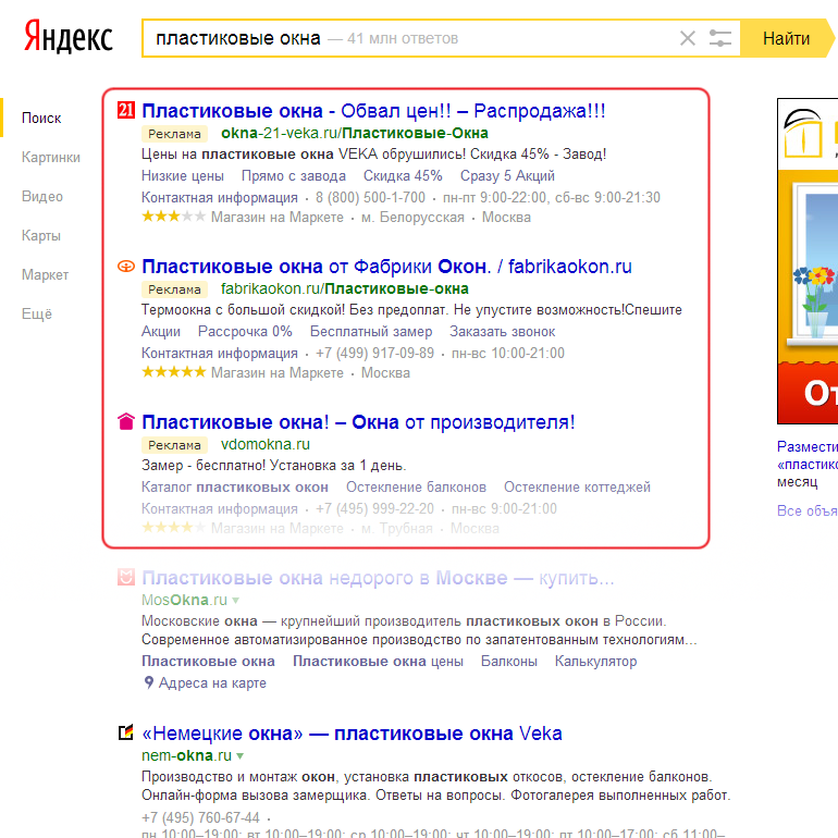 Контекстная реклама наиболее понятна, но непроста. Сам термин «контекст», от англ. context, подразумевает связь рекламного объявления с содержанием страницы сайта, на которой оно отображается. Вот вам примеры отображения контекстной рекламы на страницах результатов поиска в Яндекс и Google по запросу «пластиковые окна»: